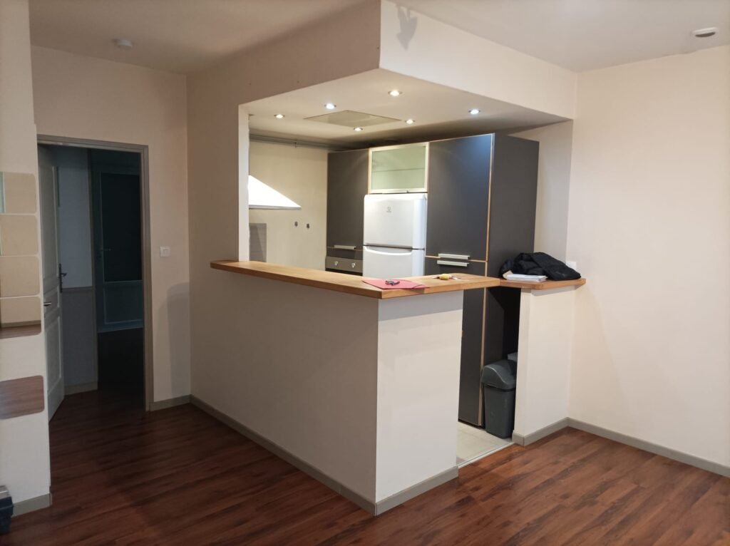 Aménagement d’une cuisine ouverte avec création d’un espace bar, intégration des éclairages et finitions soignées pour un espace moderne et fonctionnel.