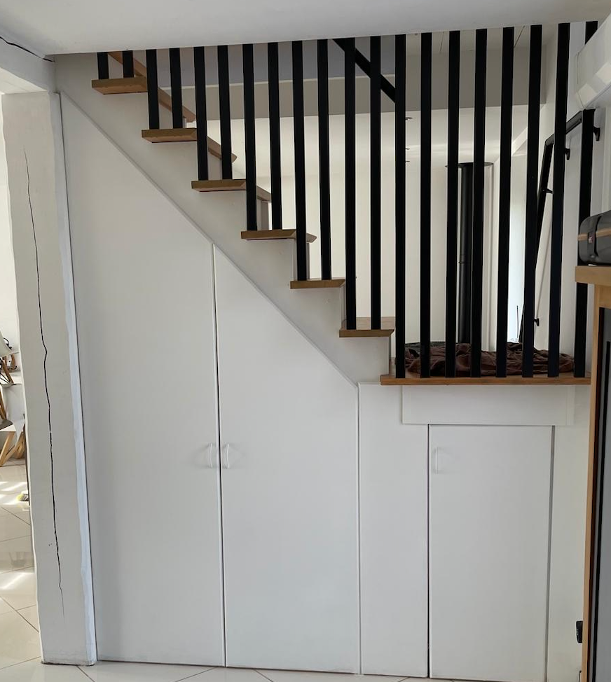 Création d’un aménagement sous escalier avec rangements sur mesure et claustra décoratif pour optimiser l’espace.