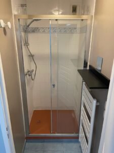 Installation d’un espace douche avec receveur, robinetterie et paroi vitrée pour une salle de bain fonctionnelle.